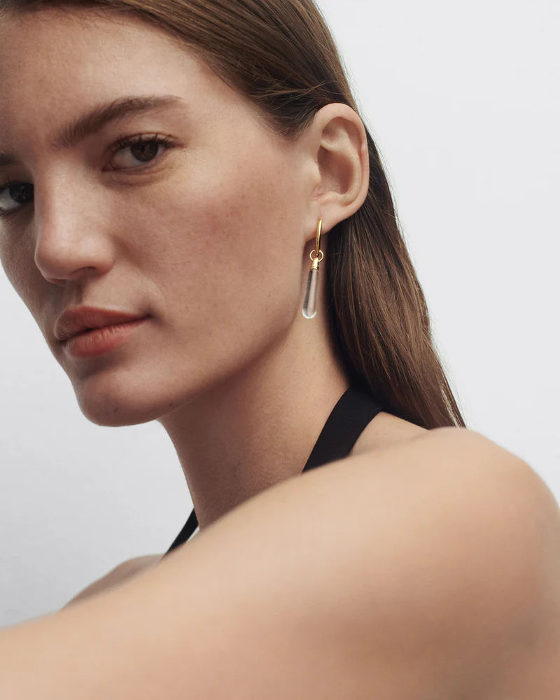 En el centro de Aqua se encuentran los tonos hipnóticos del ágata azul y el cristal de roca, tallados y pulidos a mano por nuestros artesanos expertos y engastados en plata bañada en oro de 18K. Una paleta etérea que evoca el movimiento y la claridad del agua.
