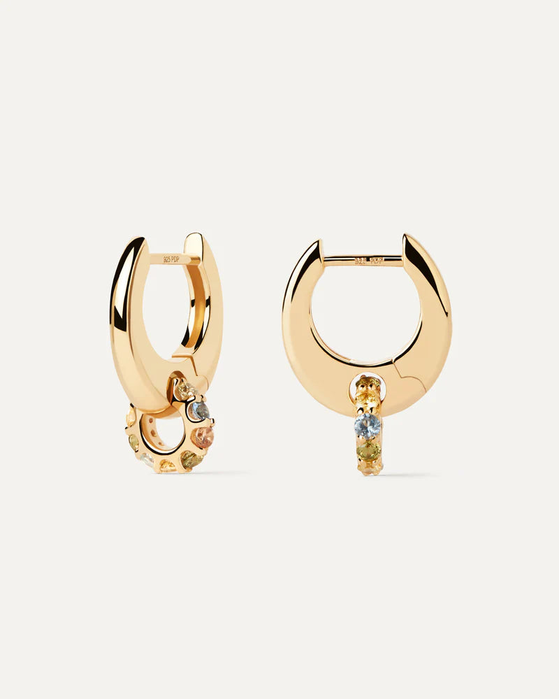 Aros de plata bañada en oro con un colgante redondo de circonitas cúbicas multicolores