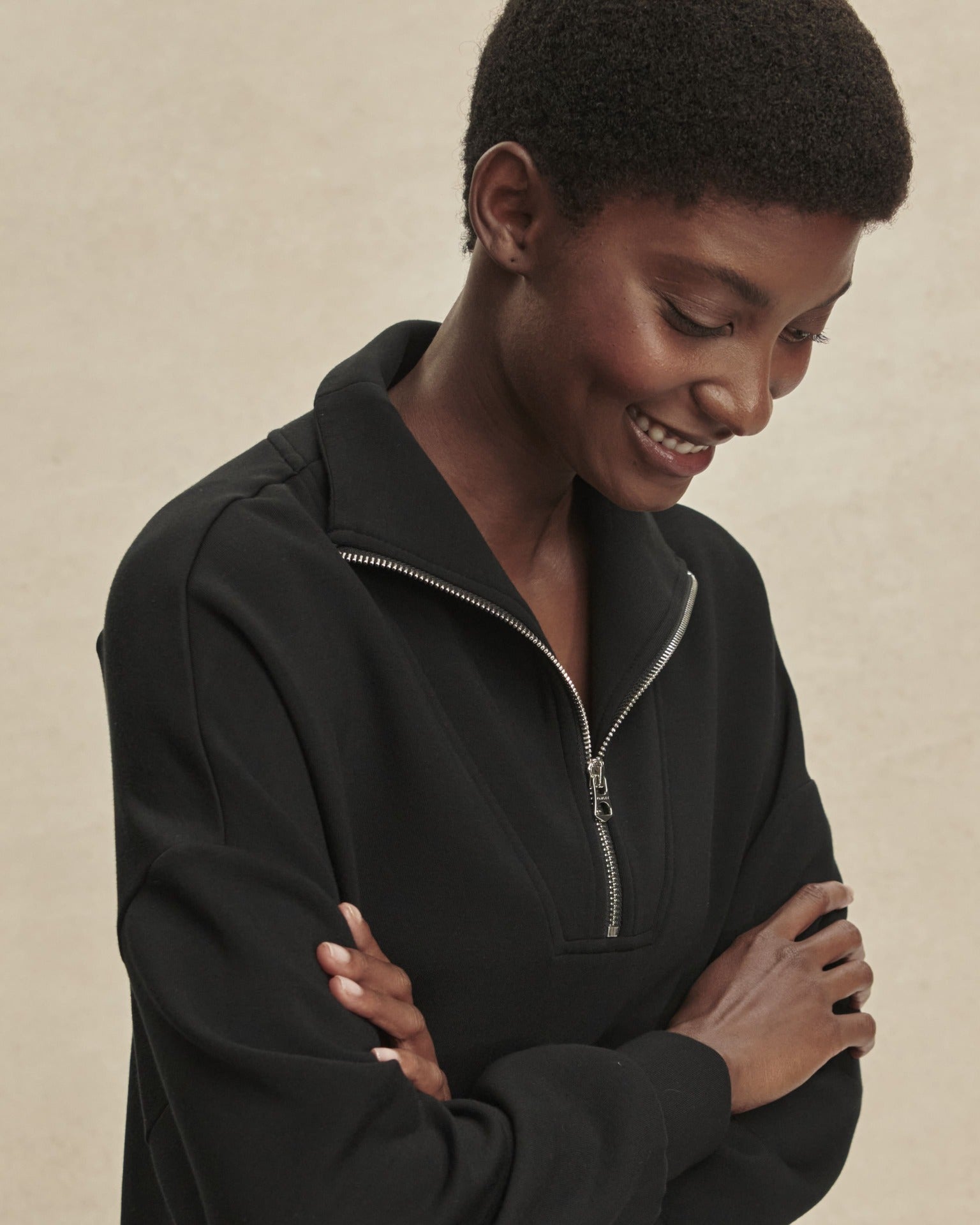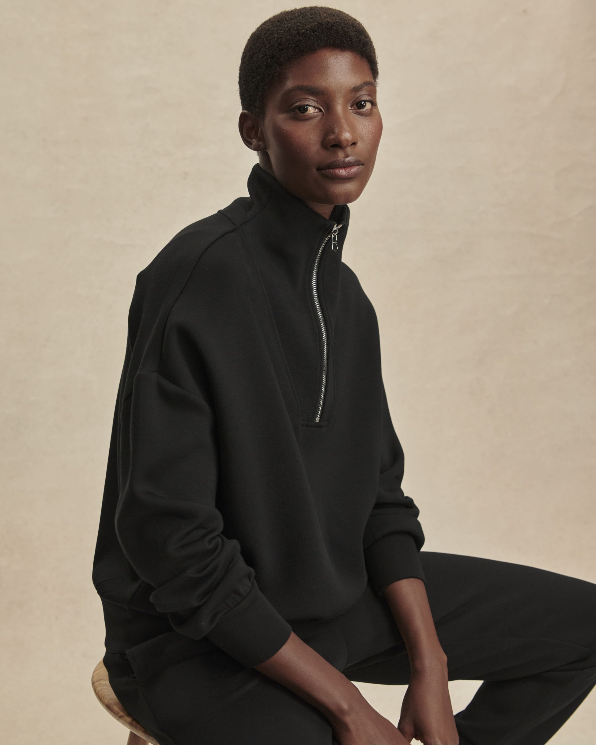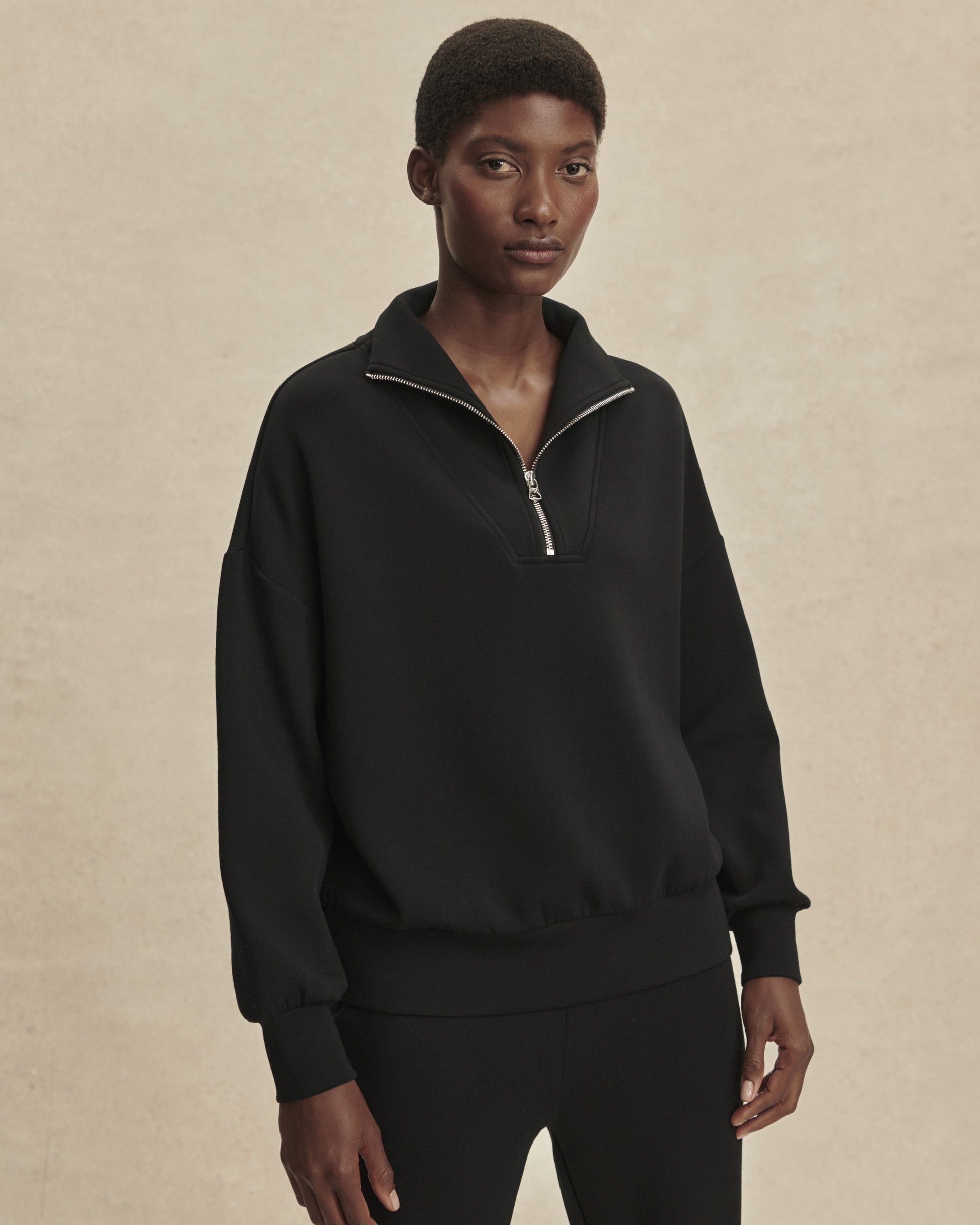 Con un corte oversize, esta versátil sudadera presenta un cuello con paneles y media cremallera, puños amplios con bajo. Confeccionada con nuestro exclusivo tejido DoubleSoft®, está diseñada para llevarla en cualquier momento.