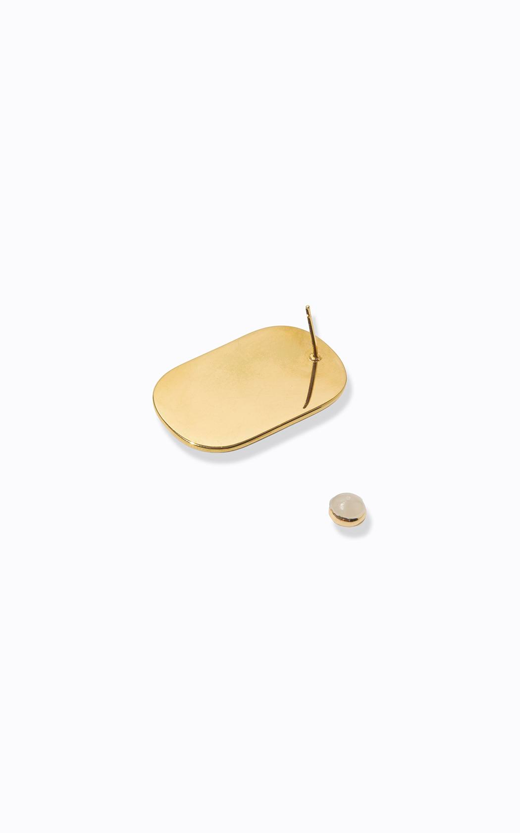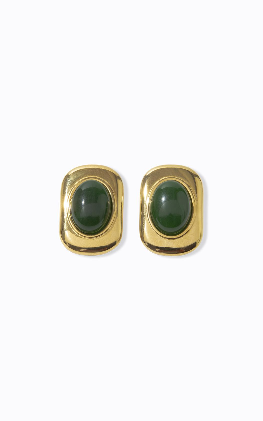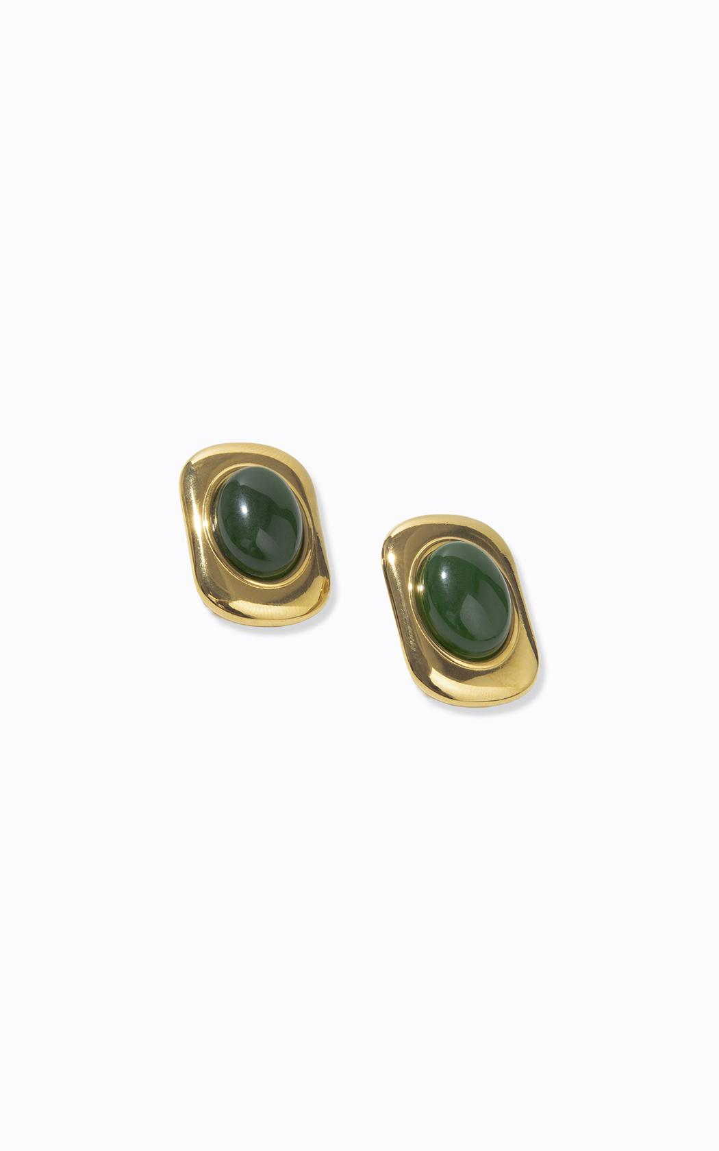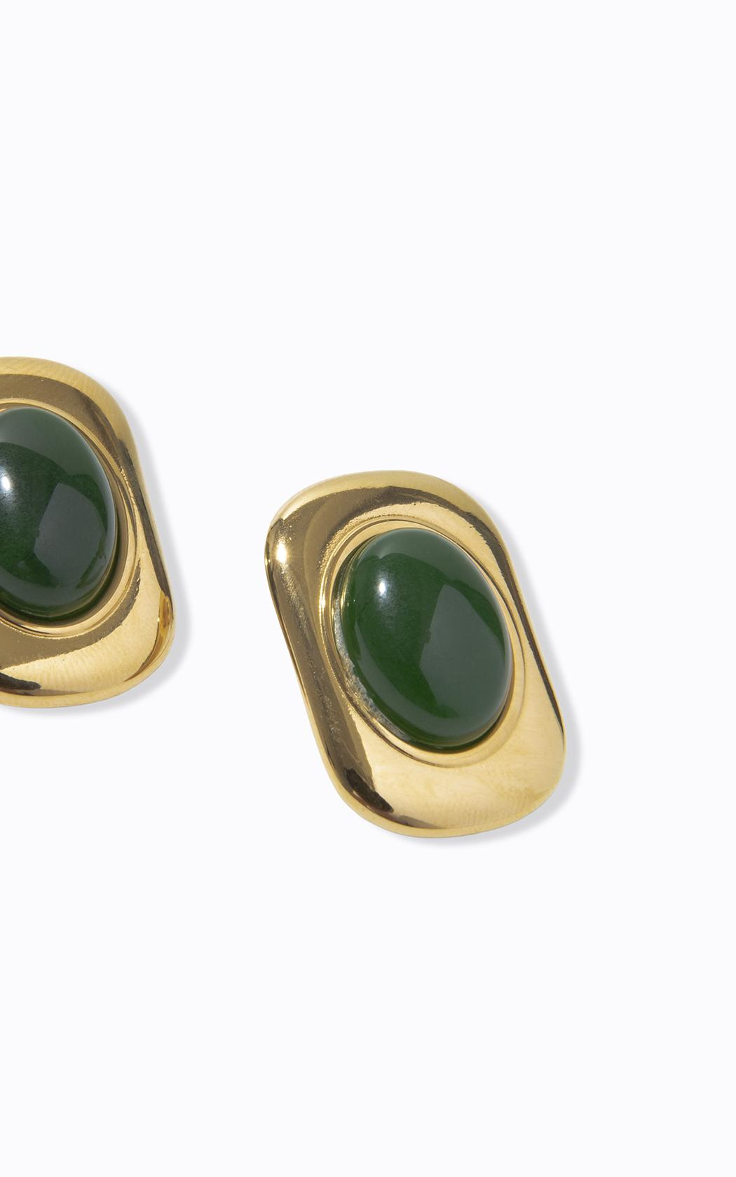 Hecho de metal con acabado dorado, el pendiente presenta una forma orgánica y líneas suaves que rodean una piedra central en un tono verde intenso, creando un contraste refinado, y el cierre de pasador garantiza practicidad y seguridad al usarlo.