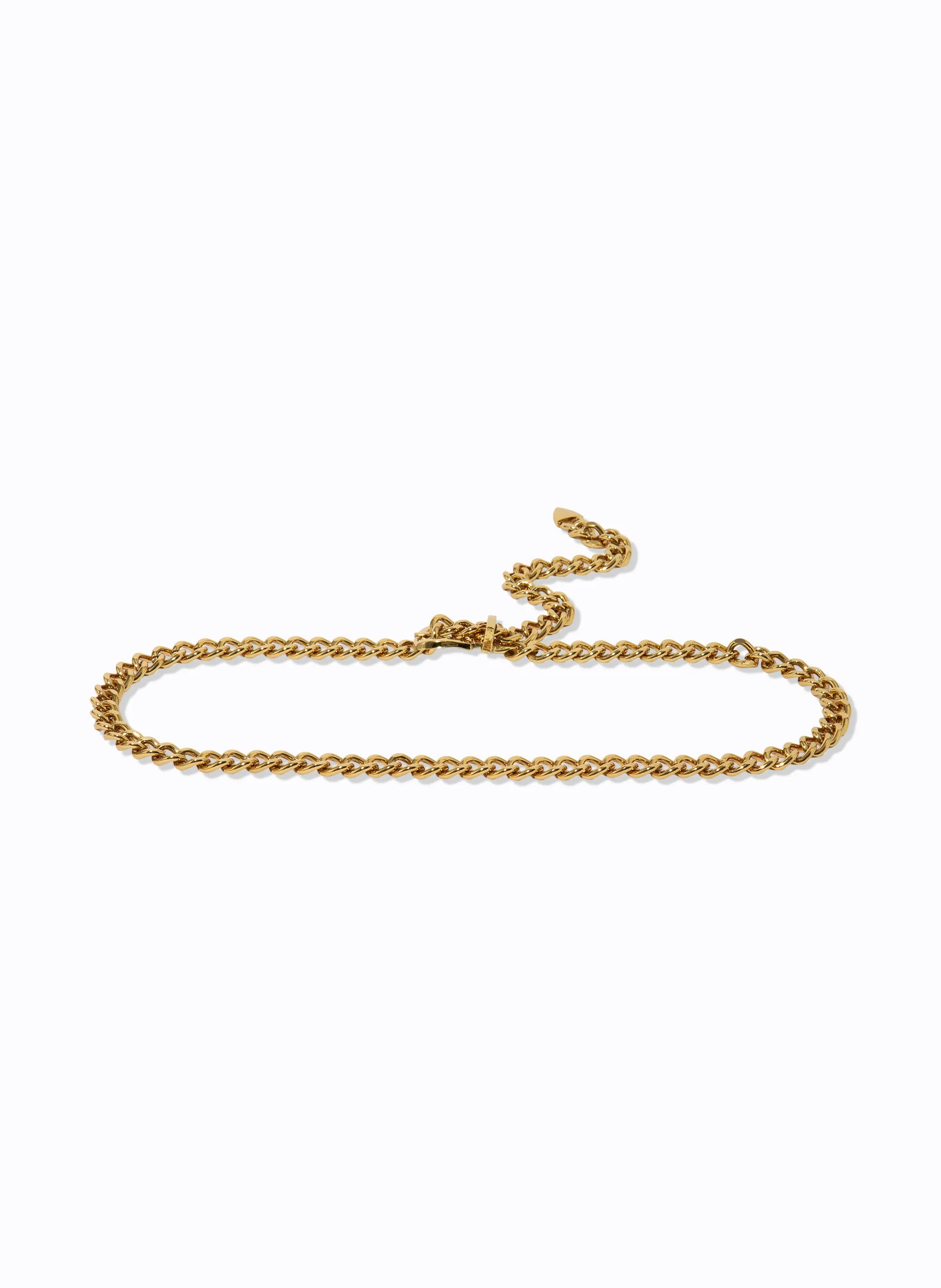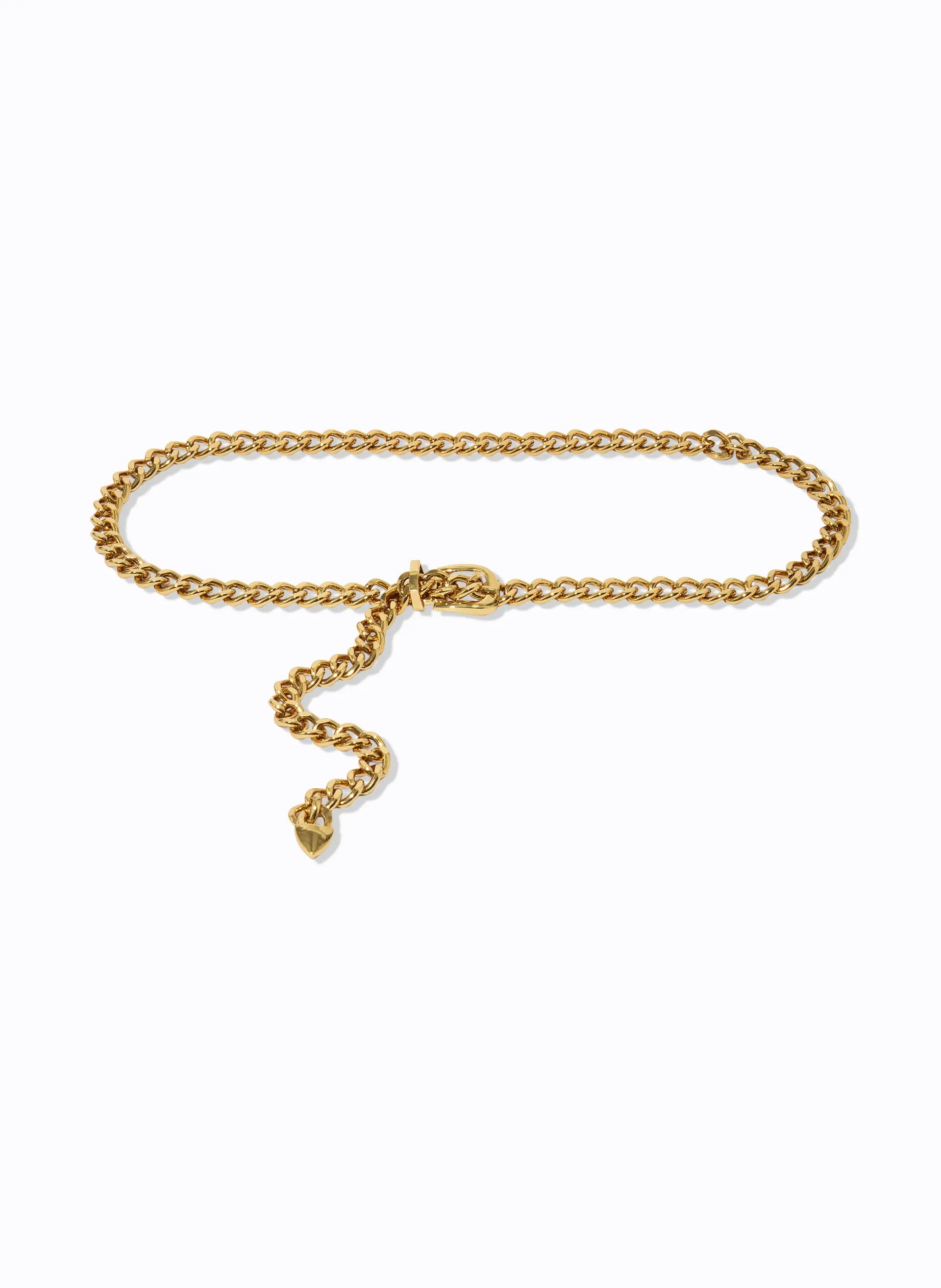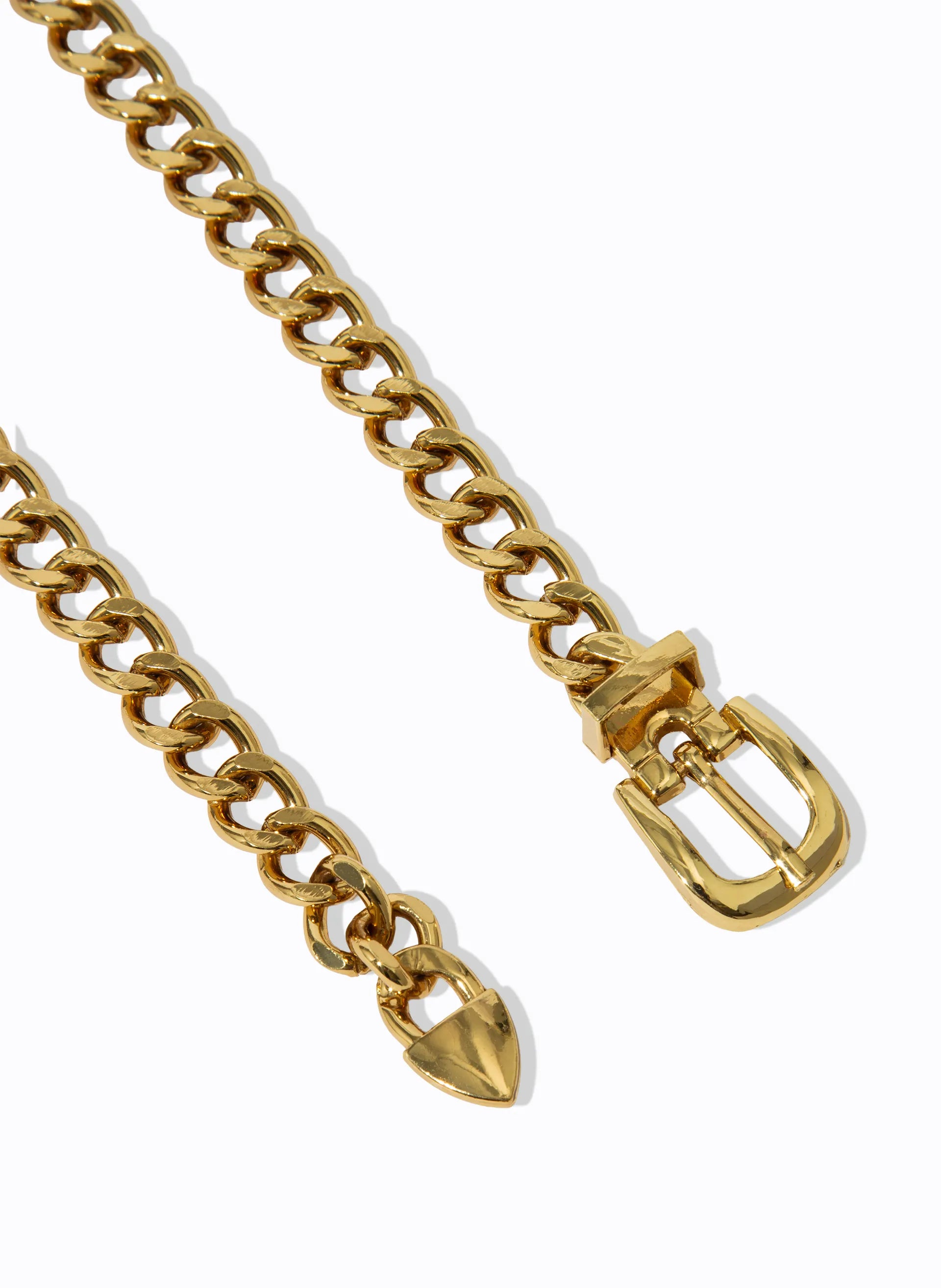 Hecho de metal, el cinturón presenta una gruesa cadena dorada con eslabones entrelazados, una hebilla metálica del mismo tono, un detalle de cadena larga con punta y un acabado pulido y brillante.
