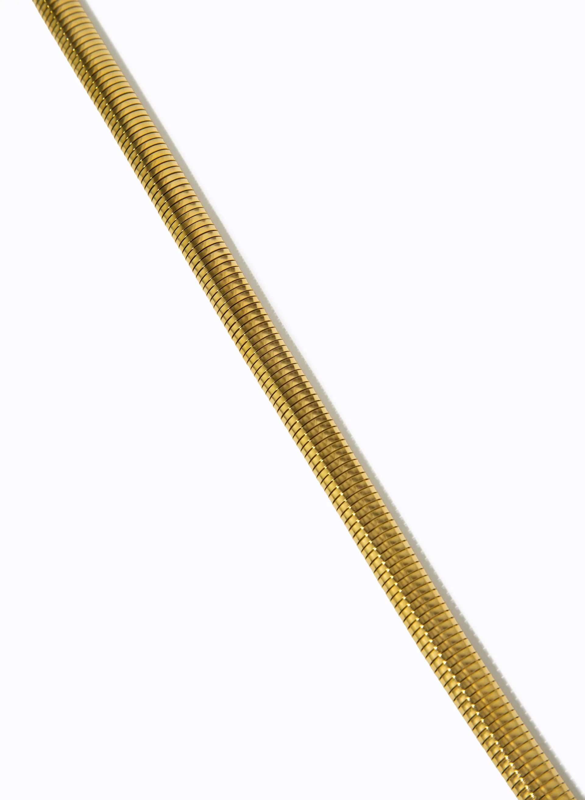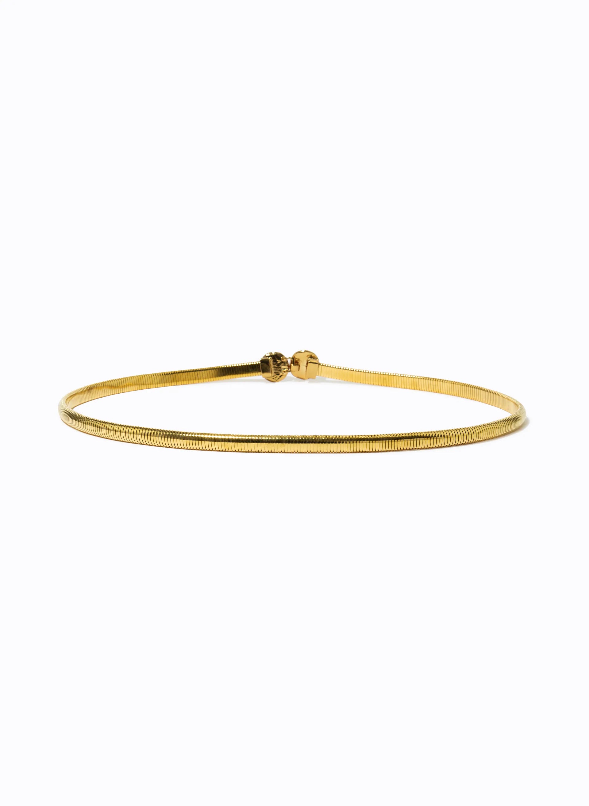 El cinturón, de metal, presenta una fina cadena, eslabones alargados con acabado dorado pulido, cierre de gancho ajustable y punta metálica alargada. Composición: 100% metal. Color: Dorado.