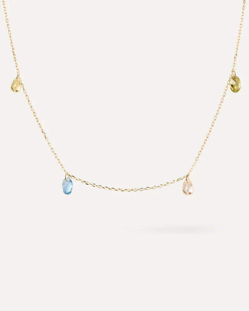 Collar cadena con cuatro colgantes de circonitas multicolores en forma de gota
