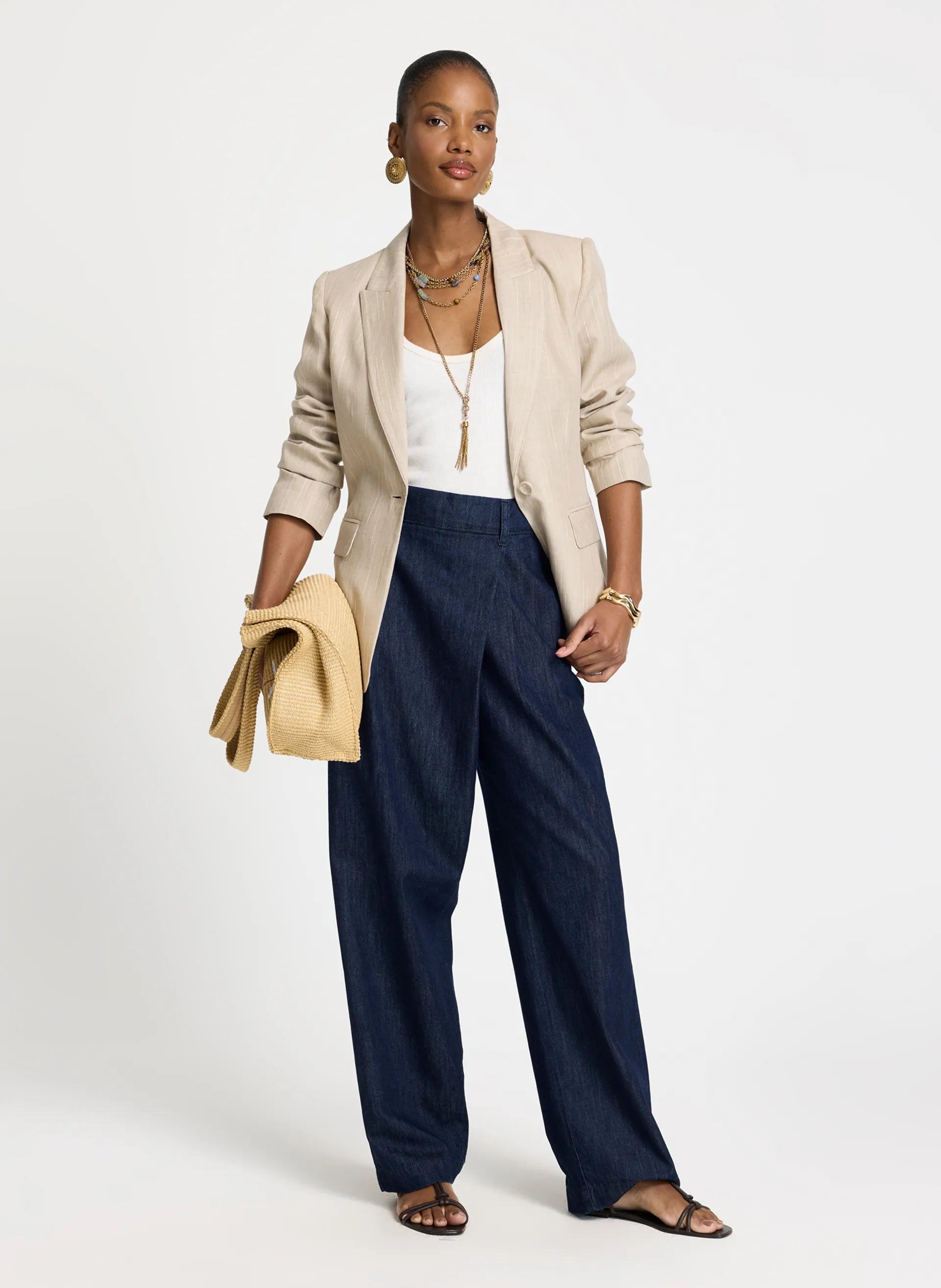 Elegantes y con un diseño cruzado, los pantalones Felina son una prenda vaquera oscura perfecta para looks impactantes. Ideales para ambientes relajados. Combínalos con un blazer ligero, una blusa básica, accesorios con colgantes llamativos, un bolso de paja y sandalias planas para un look chic y desenfadado.