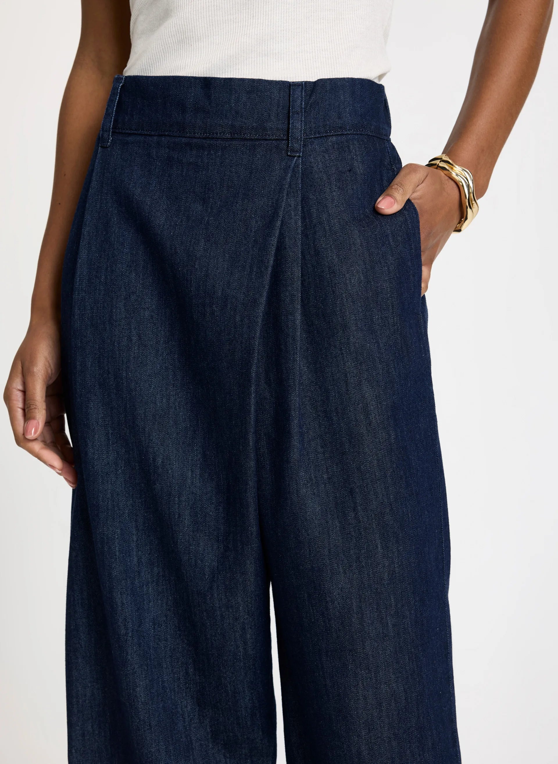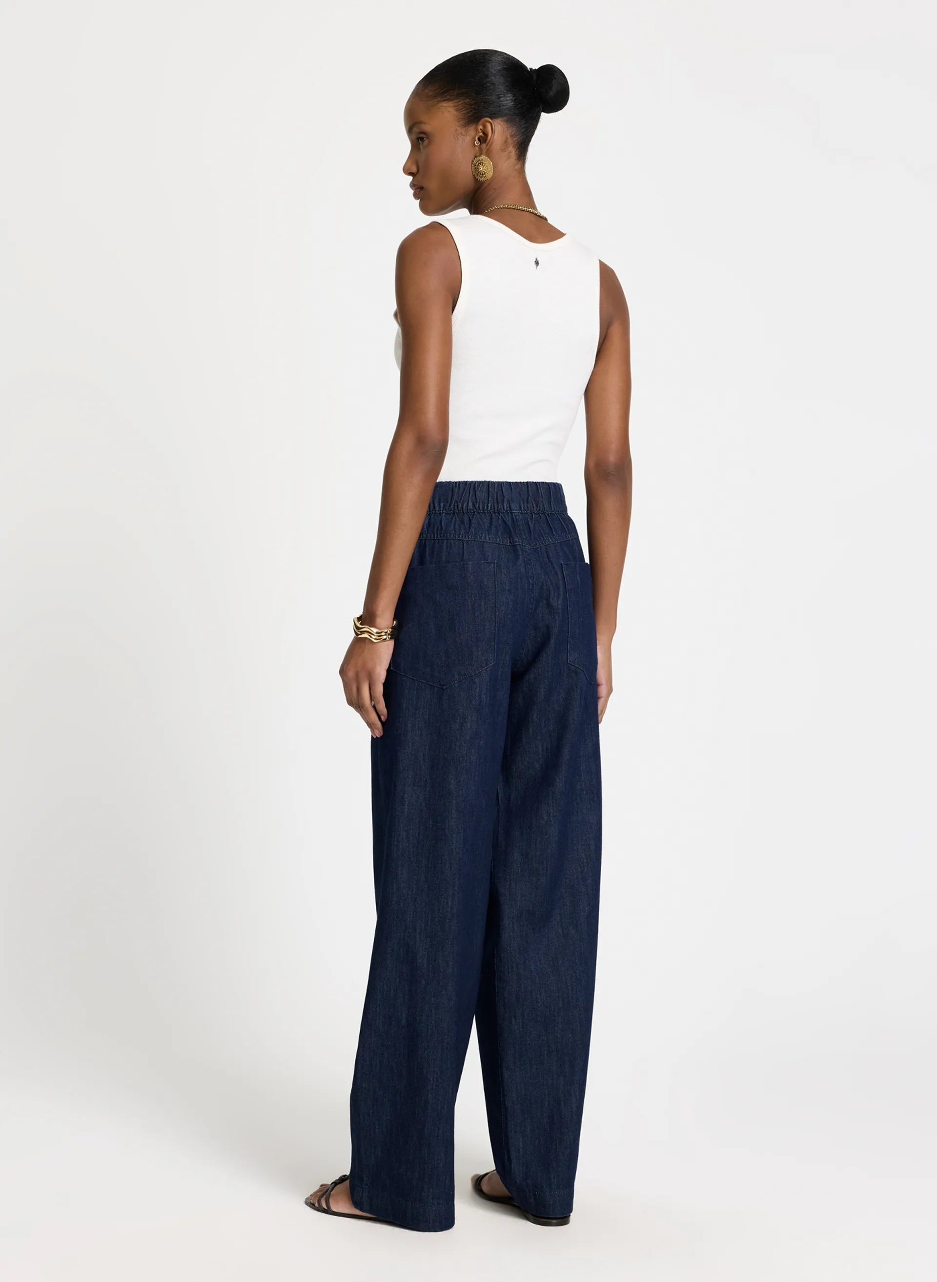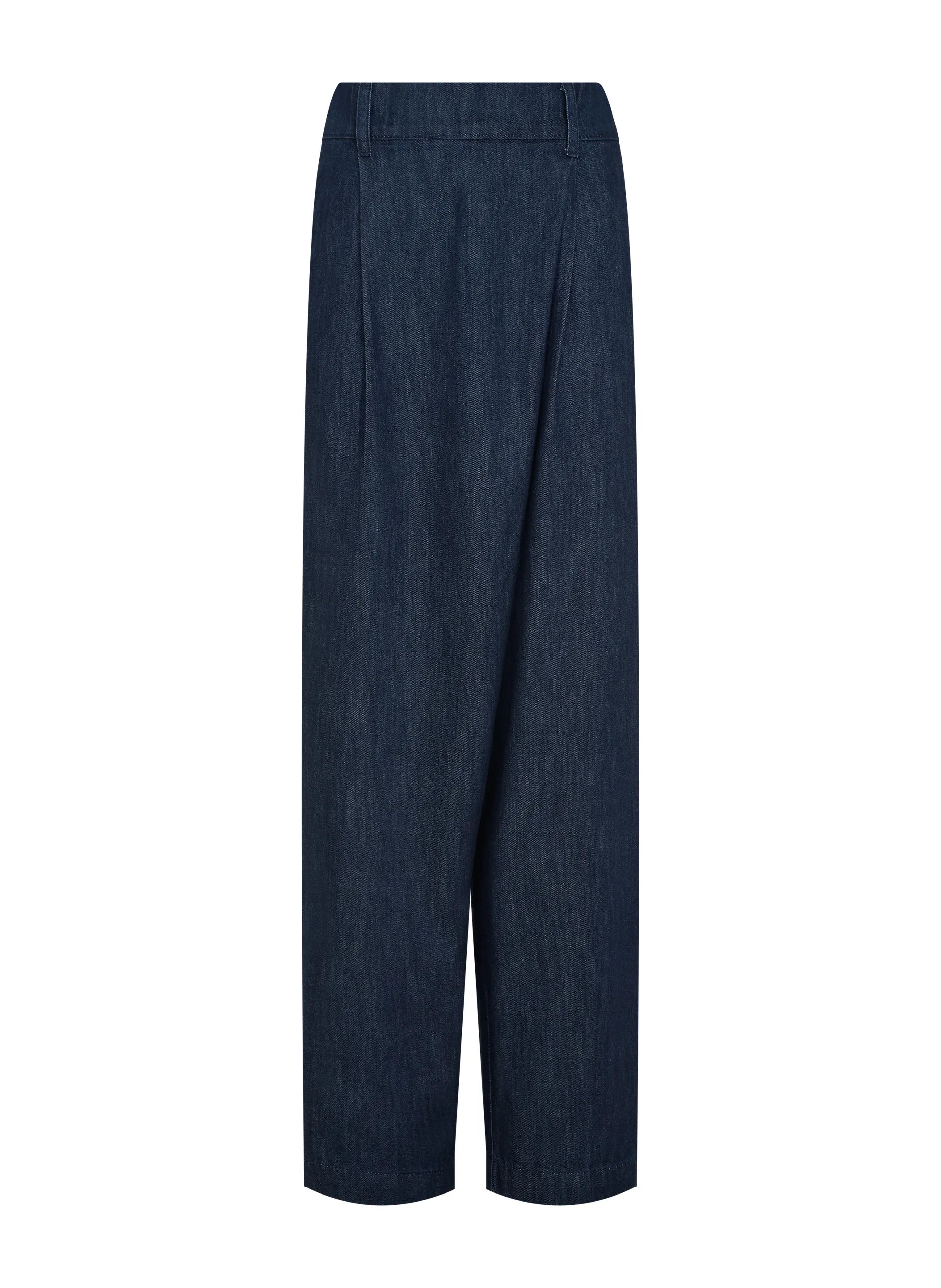 Confeccionados en denim lavado oscuro, estos pantalones presentan cintura alta, pretina con trabillas y elástico en la parte trasera, detalle cruzado en la parte delantera, cuatro bolsillos y pespuntes.