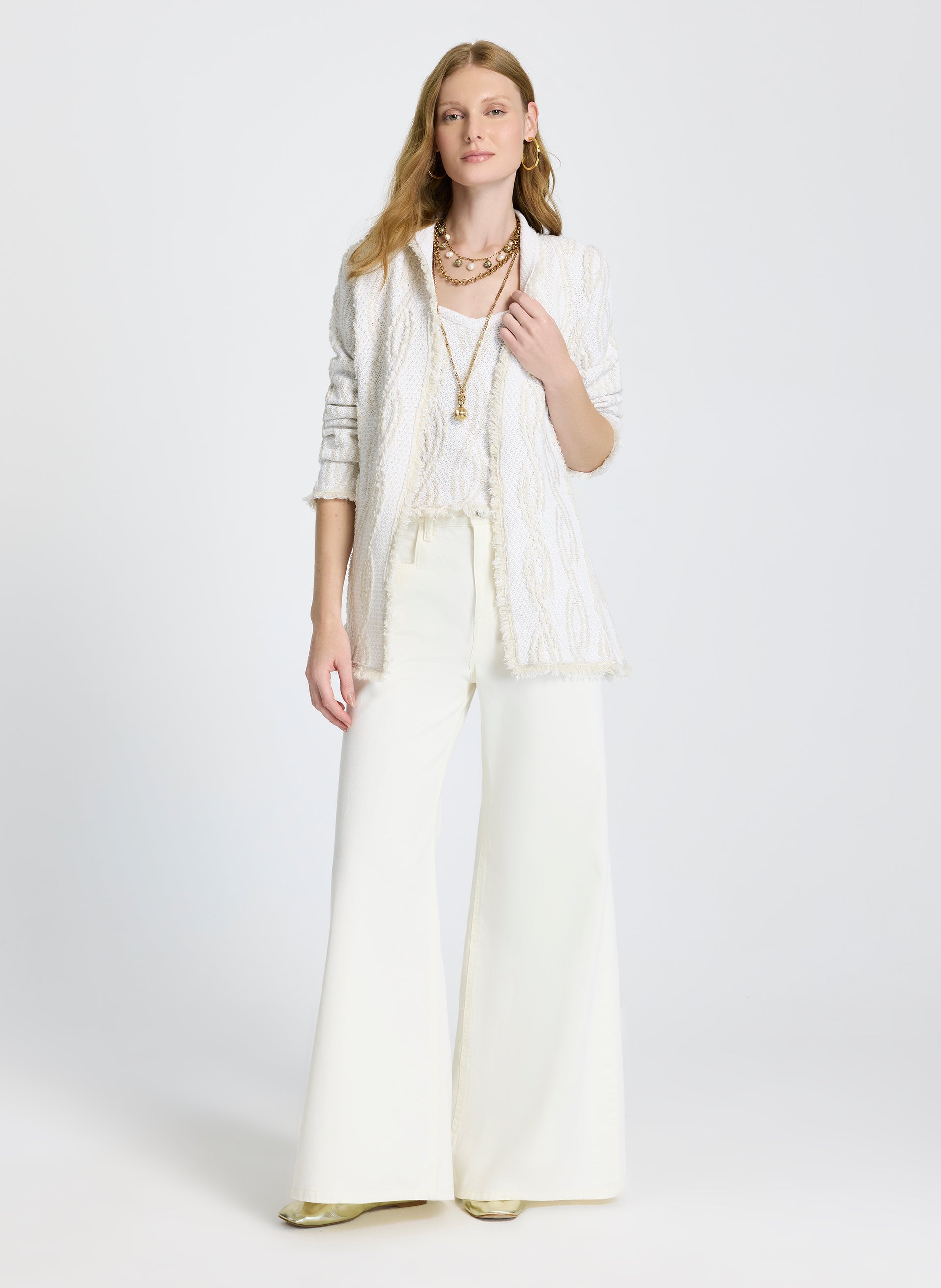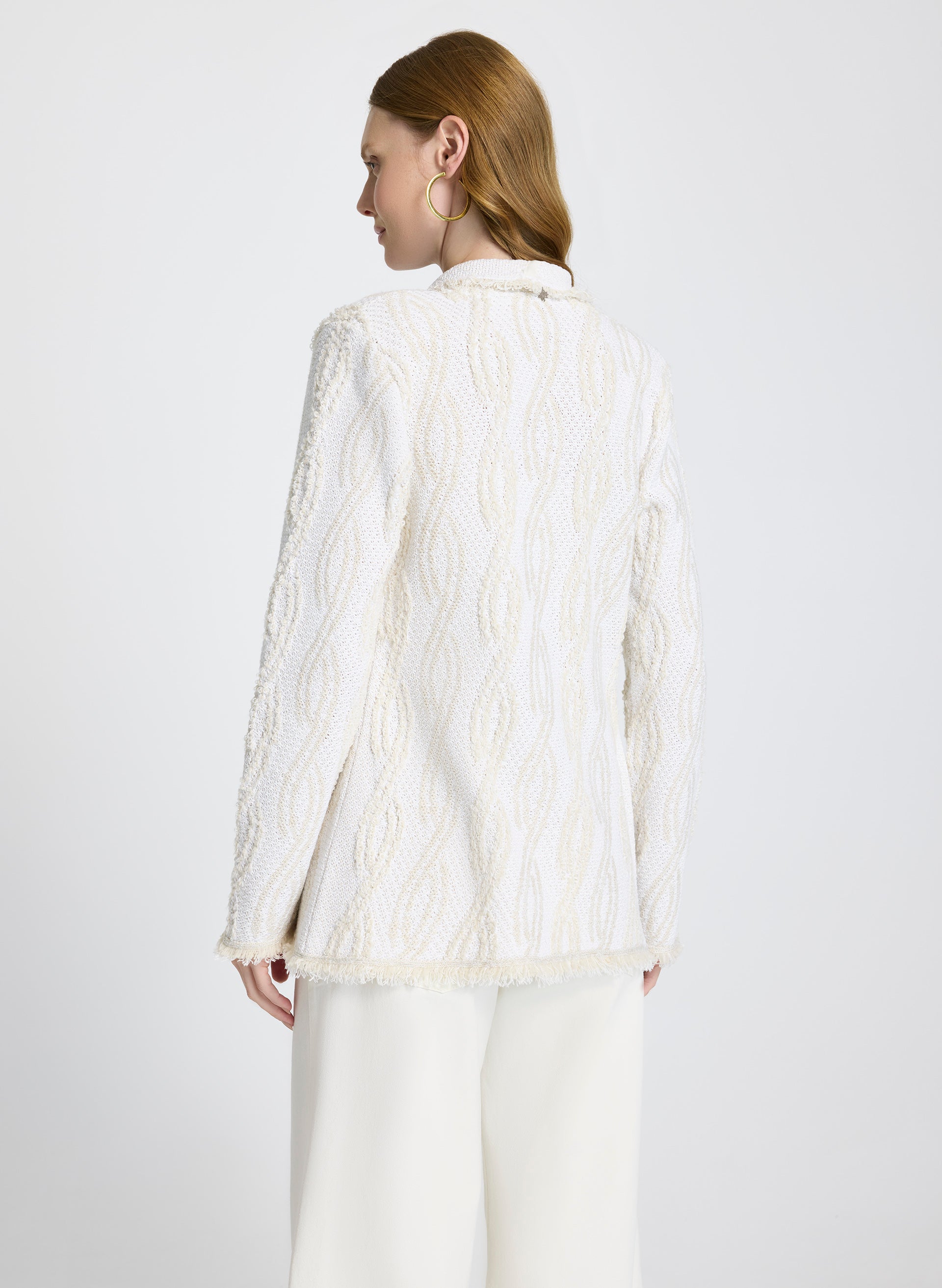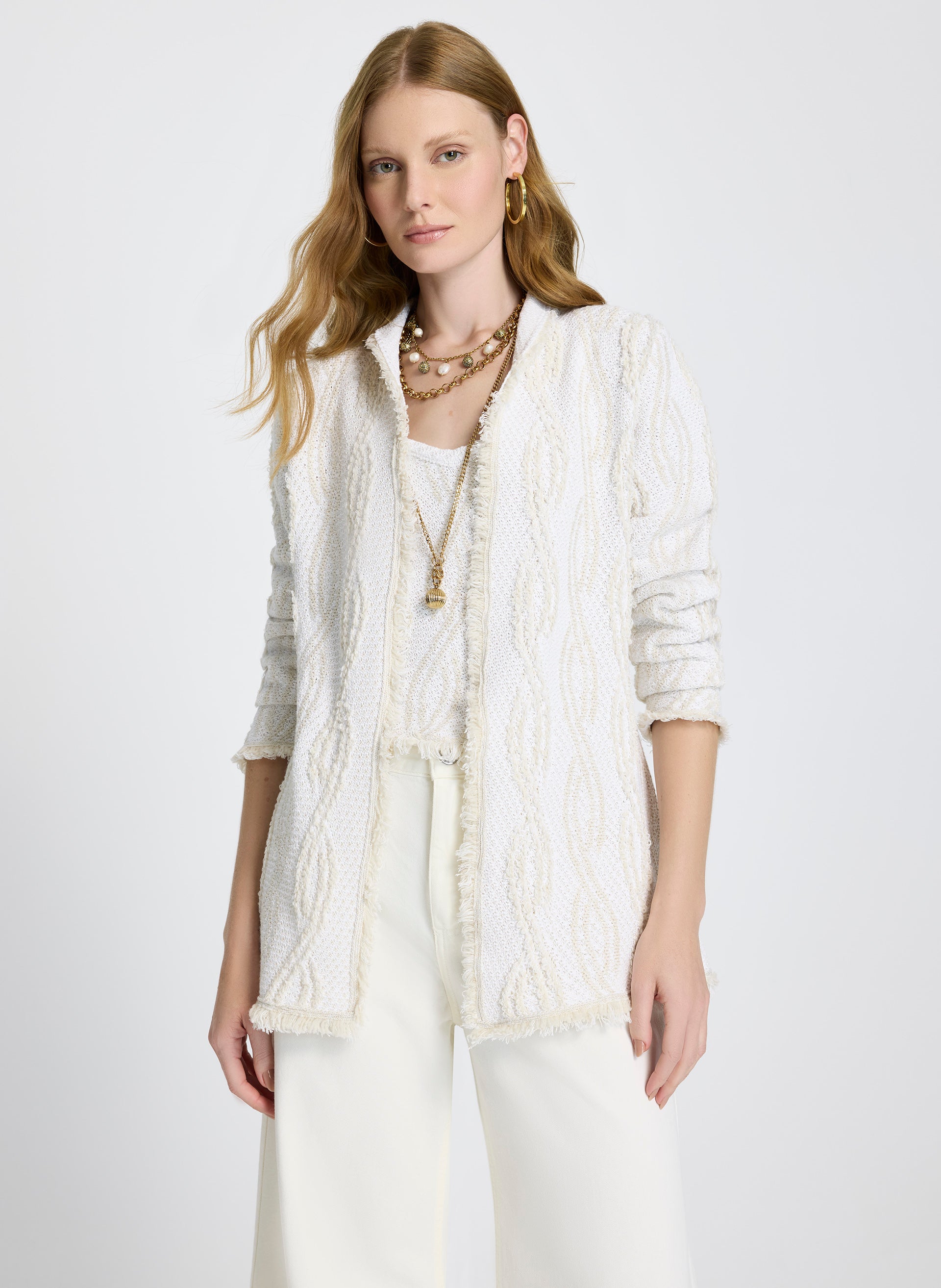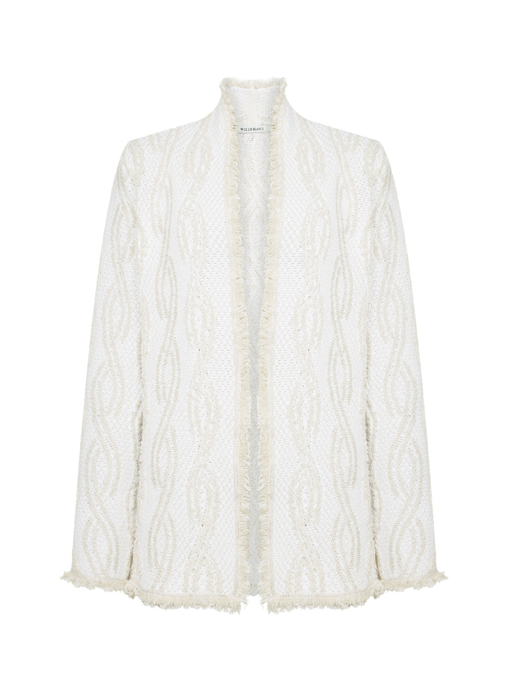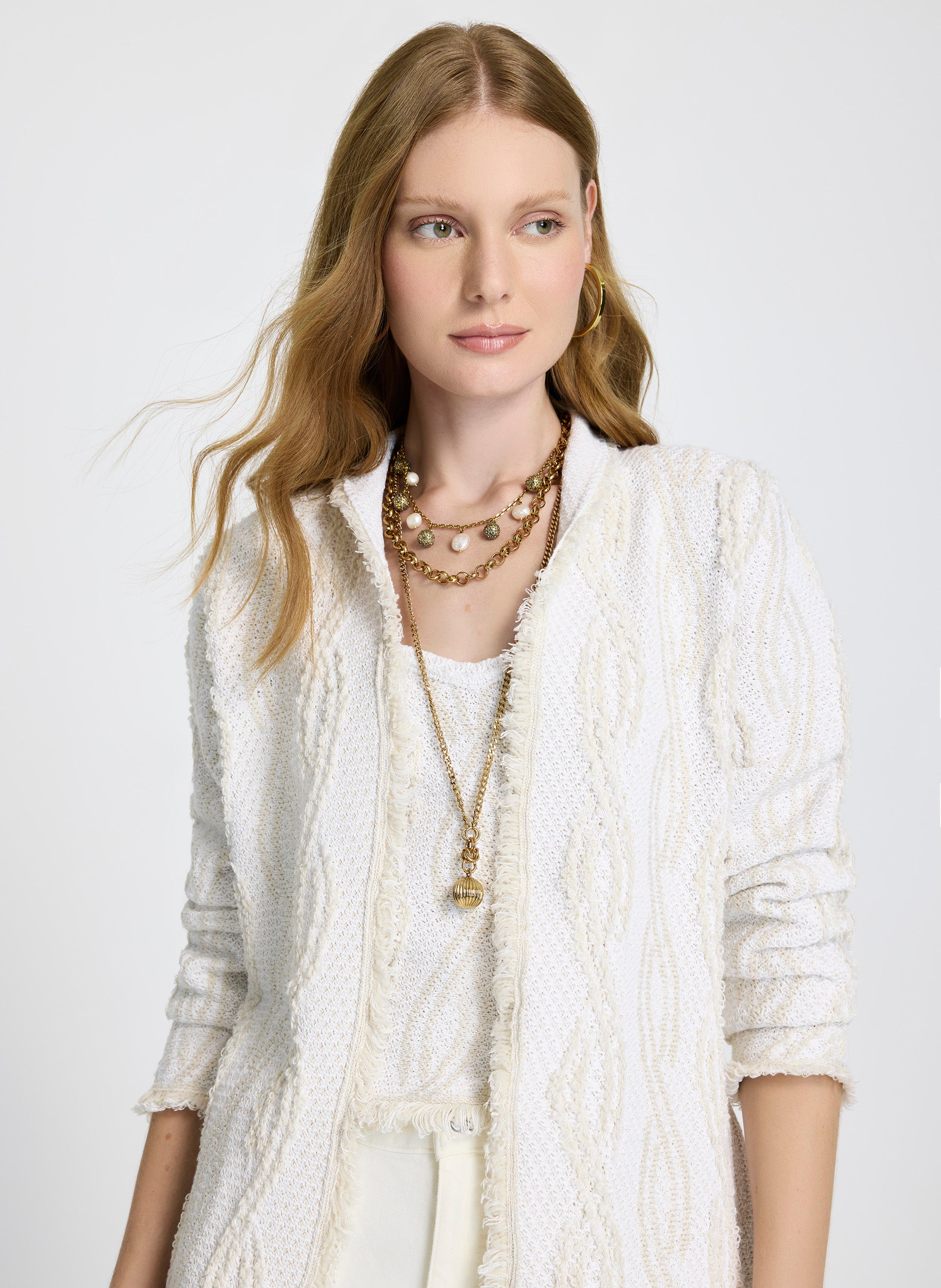 Hecho de tricot, presenta un tejido en relieve, corte recto, cuello semi alto, mangas largas y un delicado ribete de flecos en el dobladillo, los puños y el cuello.